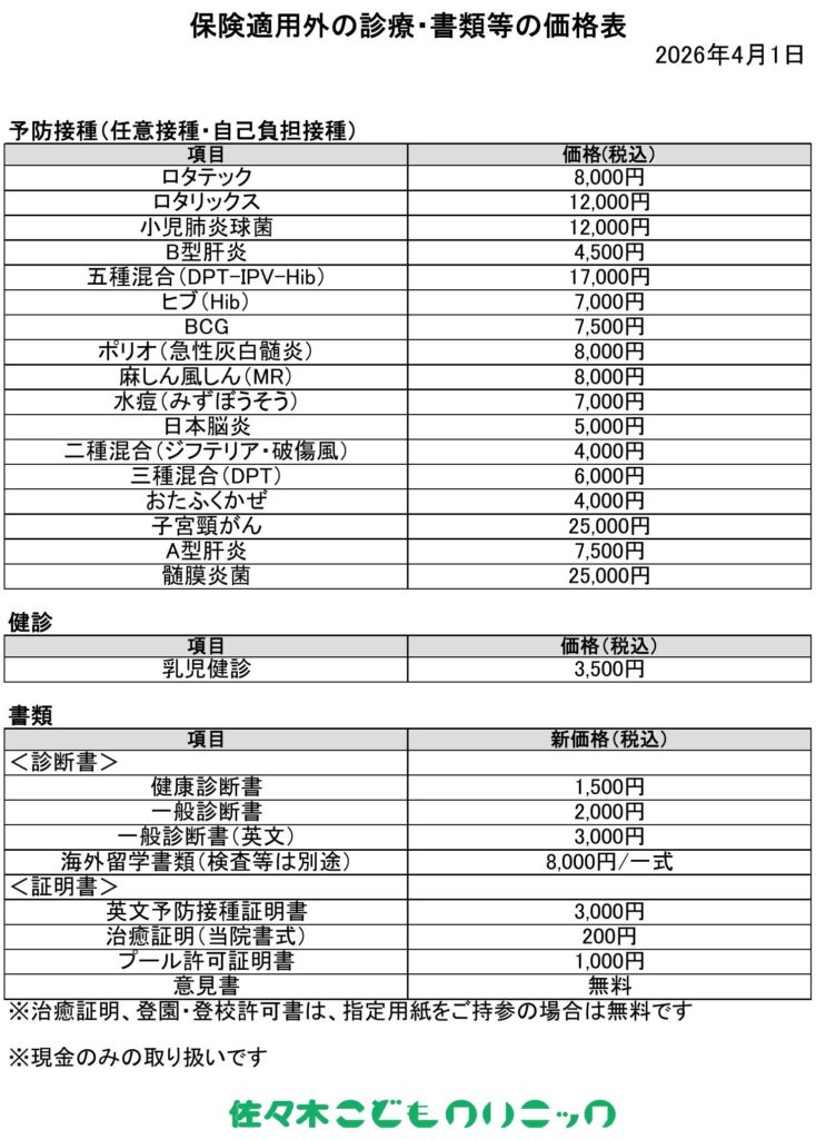 医療資材費等の高騰に伴い、2026年4月1日実施分より、任意・自己負担の予防接種を含む保険適用外の診療・書類等の価格を改定いたします。